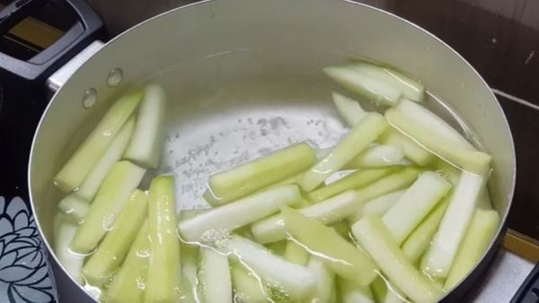 • Sau đó vớt ra, xả nước lạnh và để ráo. Bước này giúp bí có độ trong đặc trưng.